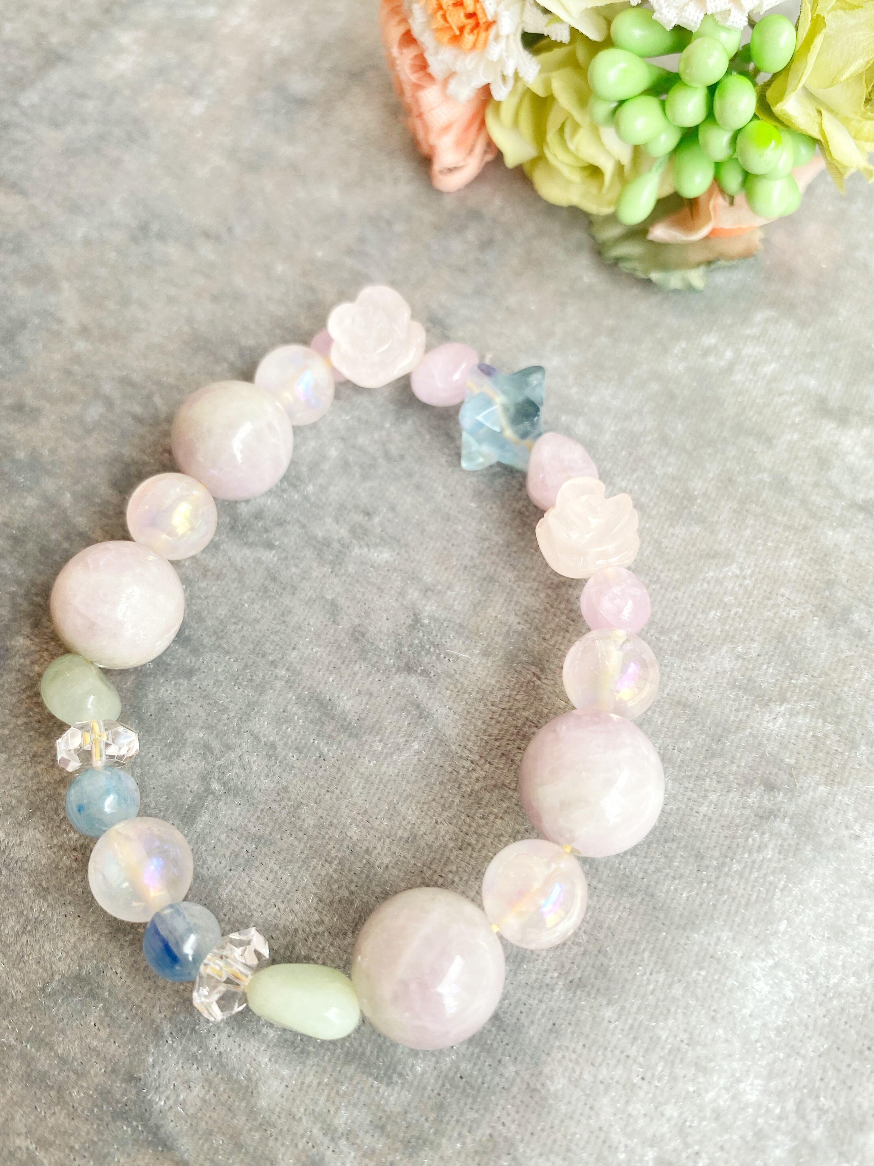 レアストーンのフォスフォシデライトをメインにローズクォーツなど思いやりの精神を育む優しいブレスレットに仕上げました