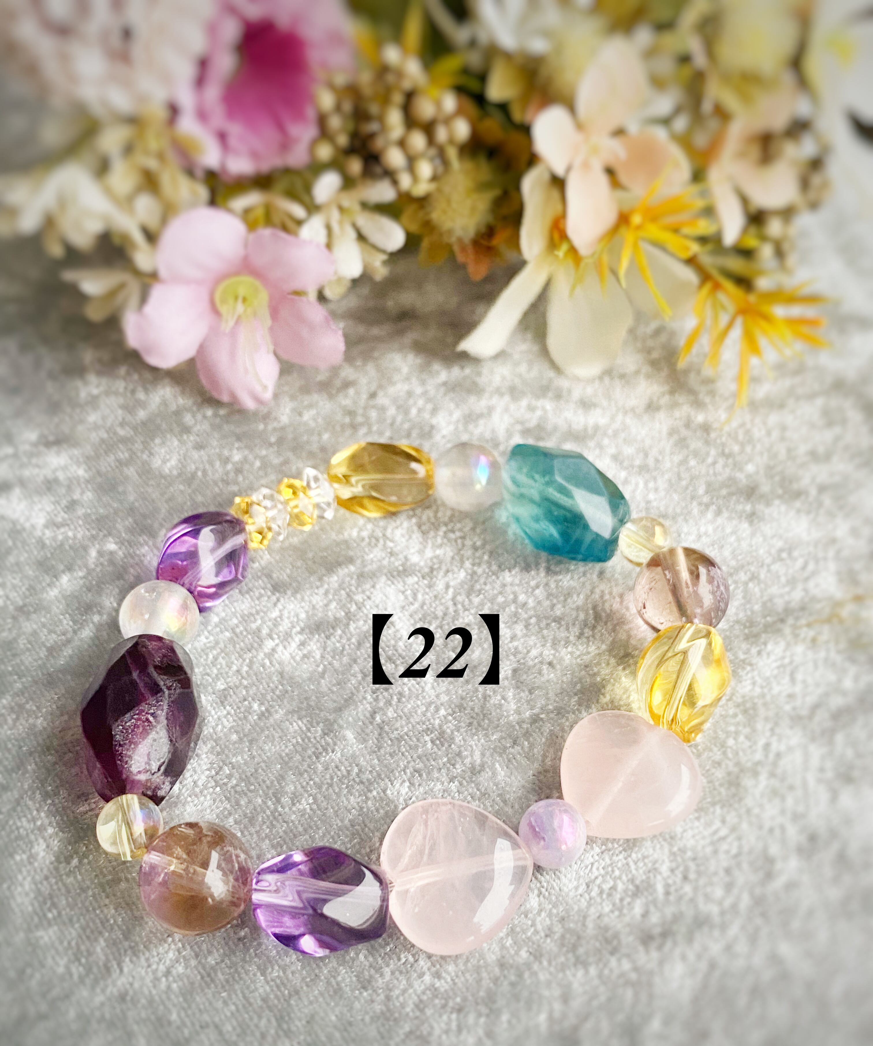 女性性アップのローズクォーツとパープル系ストーンの組み合わせで優しさを表現して